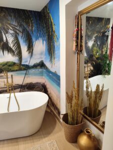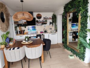 La cocina está completamente equipada y cuenta con acceso directo a una terraza privada, con bonitas vistas.