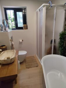 1 aseo independiente en la planta baja. Varias opciones con luz y focos en el salón.